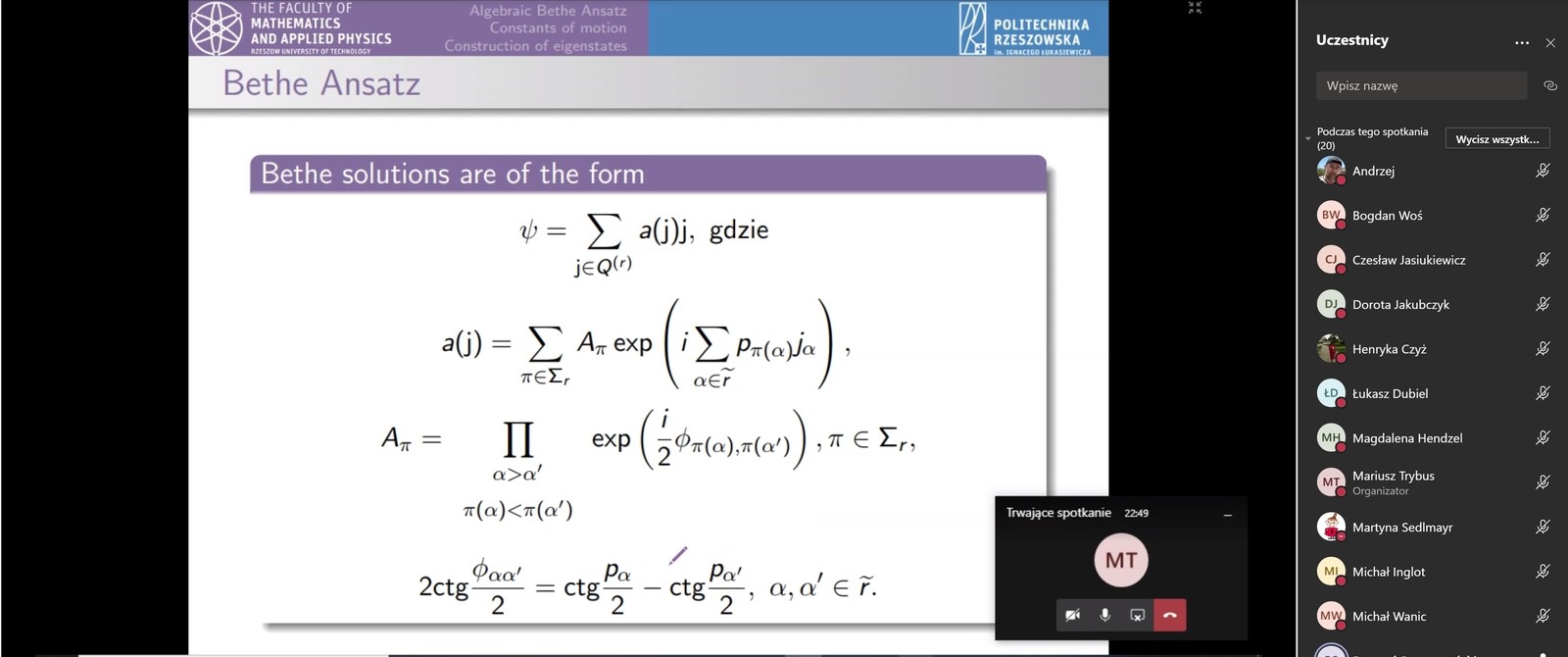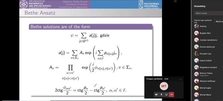 Seminarium było poświęcone analizie metod algebraicznych w zagadnieniu podstawienia Bethego (Bethe ansatz) dla jednowymiarowego układu cząstek posiadających spin. Tego typu łańcuchy stanowią rodzaj układu wielu ciał, dla których można znaleźć ścisłe rozwiązania zagadnienia własnego. Jest to powód, dla którego metody obliczeniowe stosowane przy podejściu Bethego znajdują zastosowanie w wielu aspektach fizyki matematycznej i informatyki.