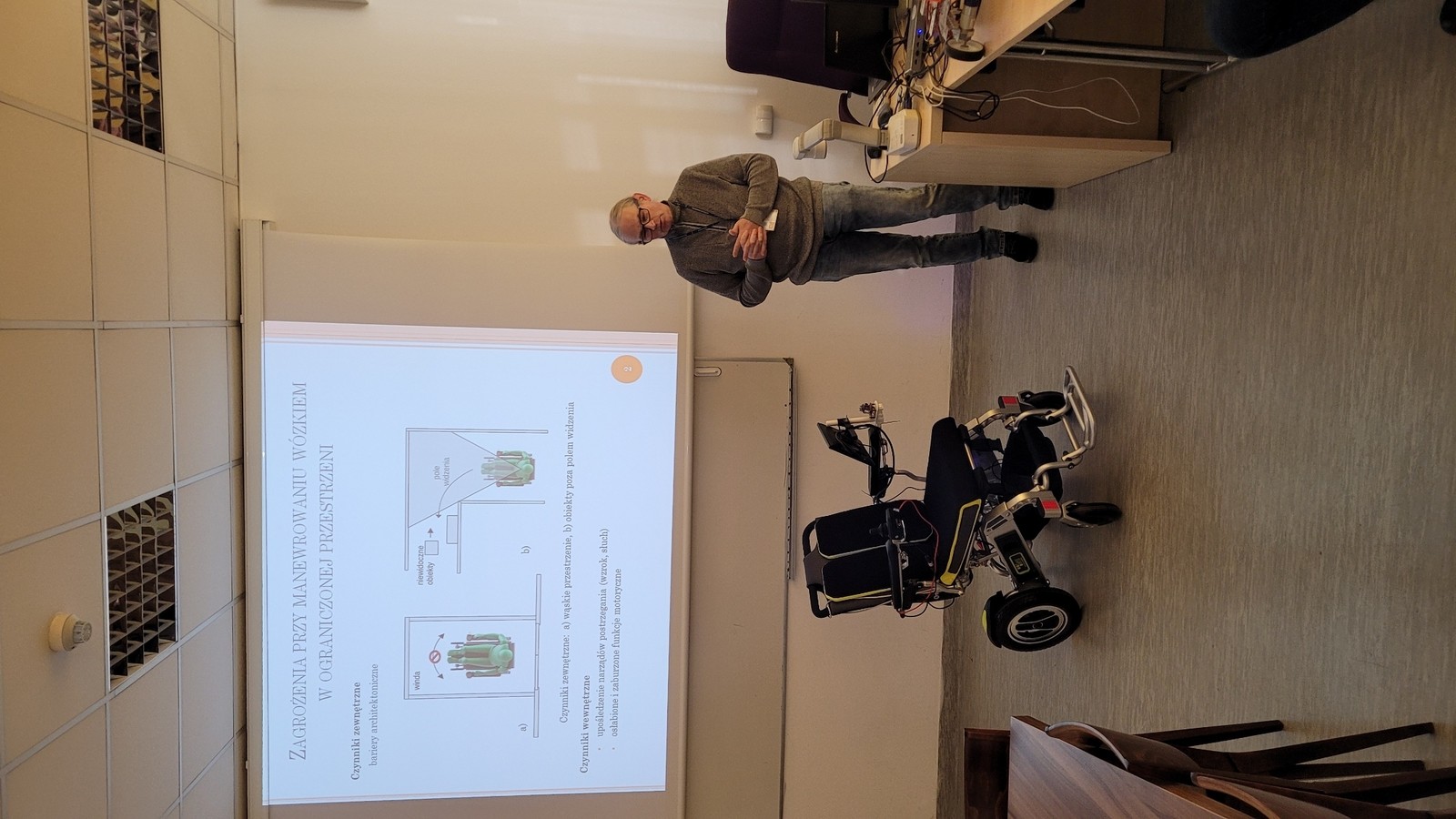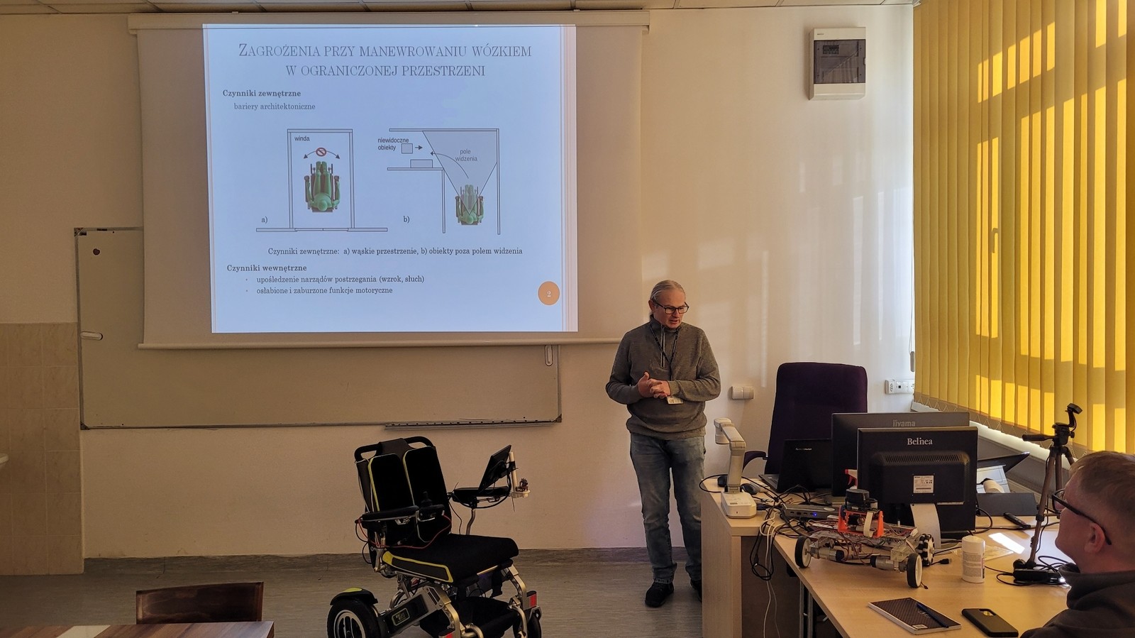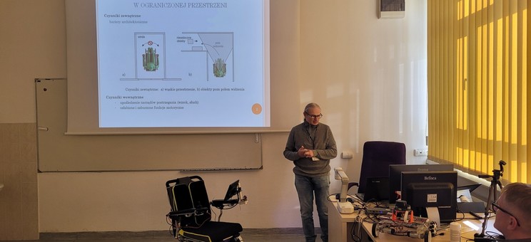 W prezentacji scharakteryzowano zagrożenie występujące podczas manewrowania elektrycznym wózkiem inwalidzkim w ograniczonej przestrzeni. Przedstawione zostały dostępne techniki detekcji przeszkód wokół pojazdu oraz autorskie rozwiązanie systemu wykrywania obiektów.