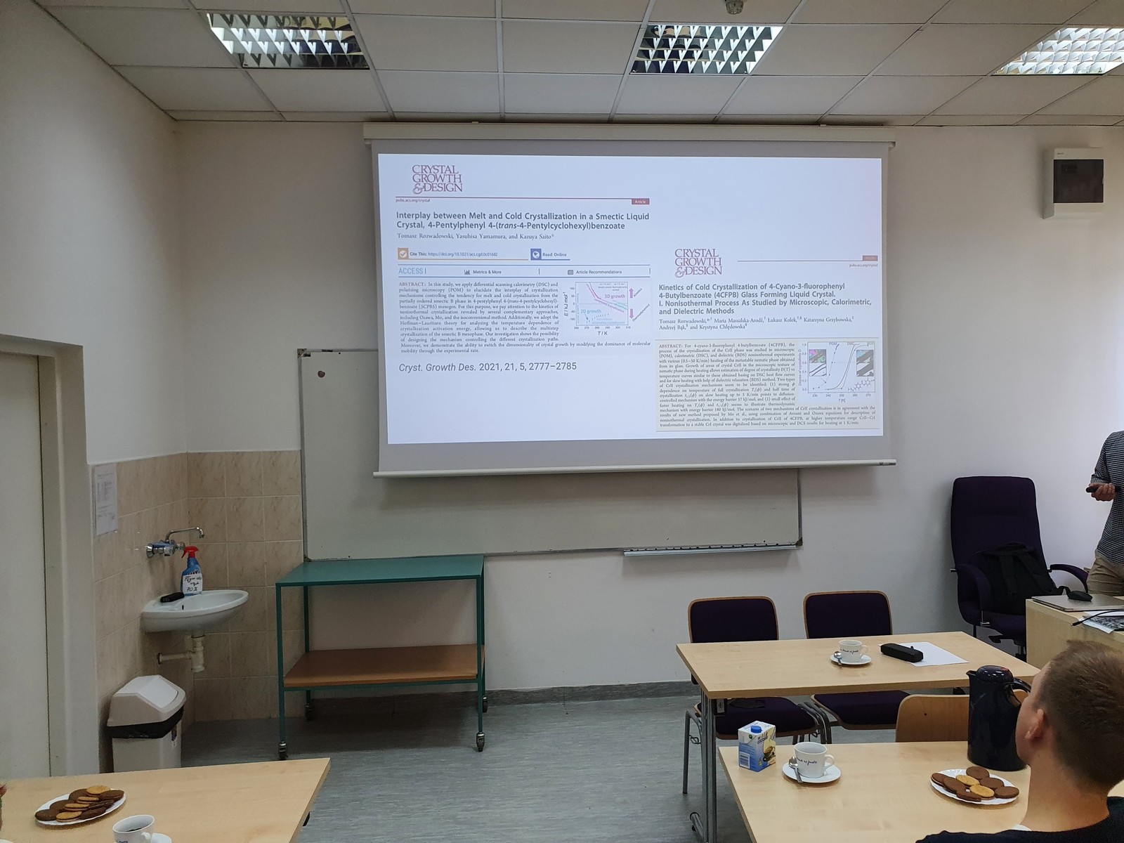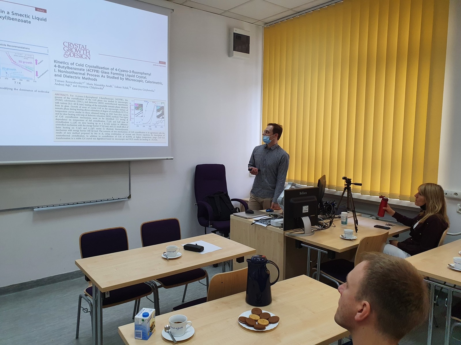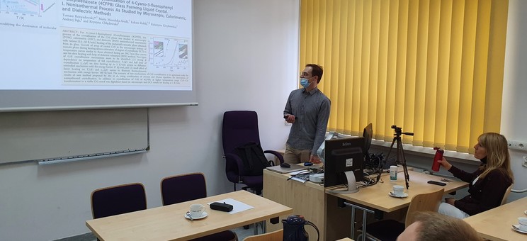 Na seminarium w dniu 2.06.2021 dr Tomasz Rozwadowski przestawił zagadnienia związane z procesami krystalizacji i zeszklenia w nematycznym ciekłym krysztale, 2,3-difluoro-4-propylofenylo 2,3-difluoro-4-(4-pentylocykloheksylo)benzoesanie (5C4FPB3). Prezentowane rezultaty badań zostały uzyskane na Uniwersytecie Tsukuba, w ramach stypendium Japan Society for the Promotion of Science (JSPS). Procesy krystalizacji i zeszklenia są obecnie jednym z kluczowych zagadnień między innymi w naukach fizycznych, chemicznych, farmaceutycznych i inżynierii materiałowej. Zrozumienie natury tych zjawisk jest nieodzowne w przypadku projektowania materiałów o określonych własnościach.