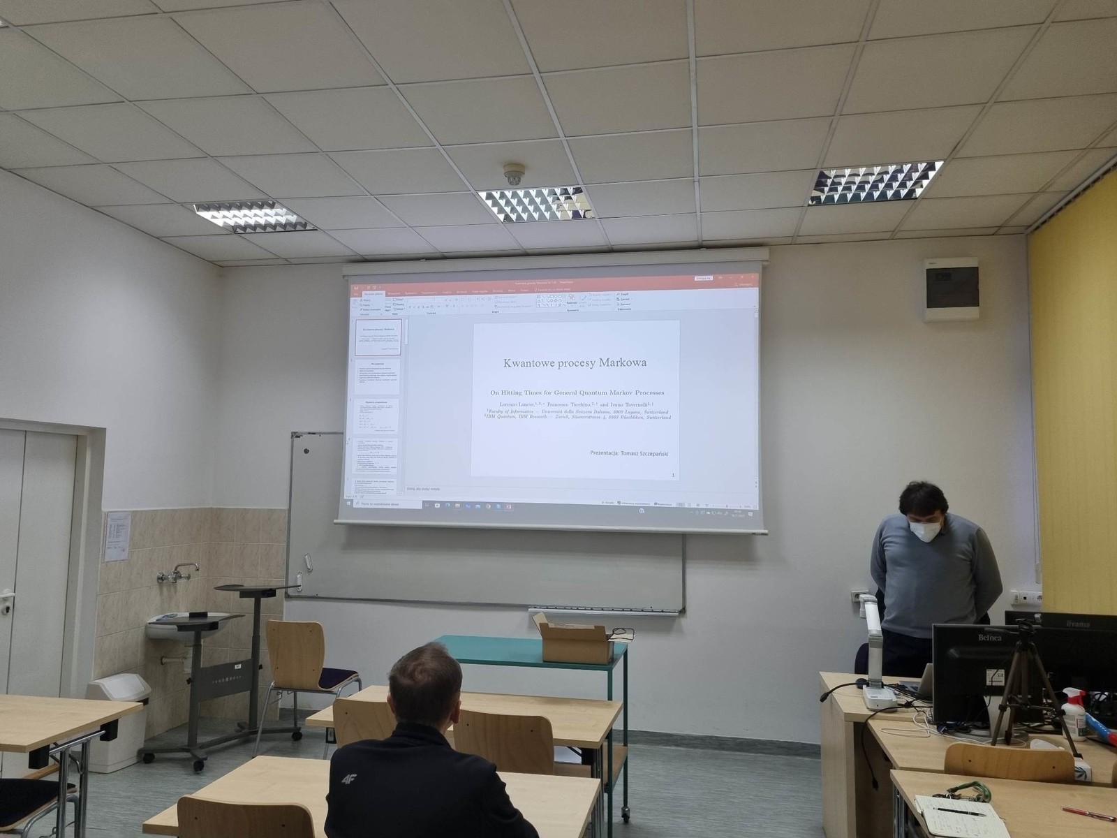 Seminarium poświęcone było omówieniu najważniejszych własności procesów Markowa w układach kwantowych. Na wstępie przedstawione zostały elementy teorii klasycznych łańcuchów Markowa na przykładzie błądzenia przypadkowego. Następnie podano metody konstrukcji modelu kwantowych odpowiedników tych procesów. W tym celu wykorzystuje się formalizm macierzy gęstości oraz definicję czasu trafienia układu do stanu docelowego. Ponadto w prezentacji opisane zostały formuły określające działanie operatorów ewolucji w przestrzeni Hilberta, a także metody rekurencyjne stosowane do wyznaczania czasów trafienia. Omówiono analogie pomiędzy klasycznym i kwantowym opisem błądzenia przypadkowego oraz metody przejścia do opisu klasycznego wykorzystującego macierze stochastyczne. Następnie prześledzono dowody wybranych twierdzeń dotyczących błądzenia przypadkowego z czasem dyskretnym i przedyskutowano możliwe kierunki rozwoju teorii procesów Markowa.