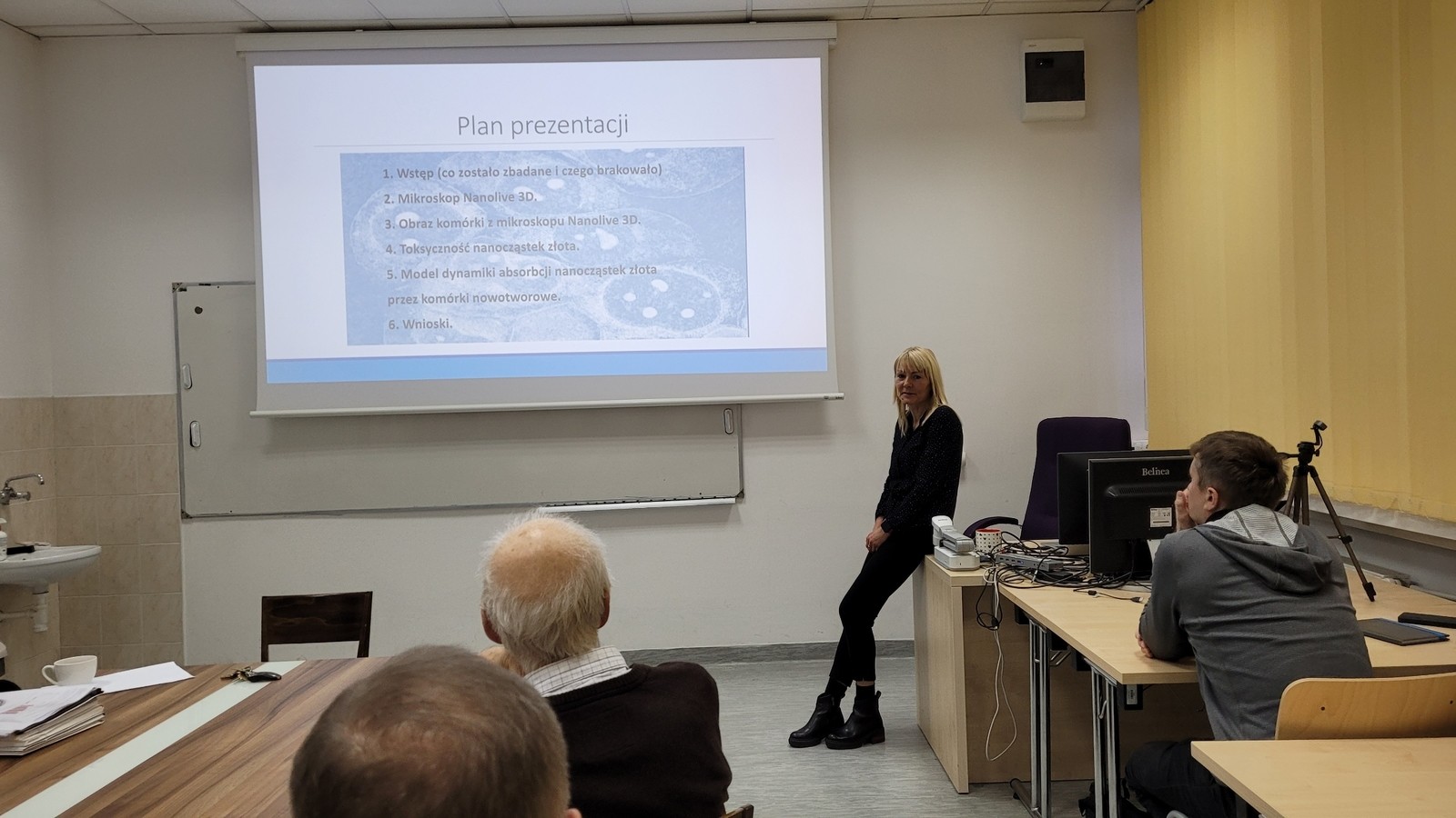 1) Omówienie eksperymentów przy użyciu mikroskopii o wysokiej rozdzielczości, dedykowanej do obrazowania hodowli komórek z nanocząstkami złota umieszczonymi w inkubatorze.