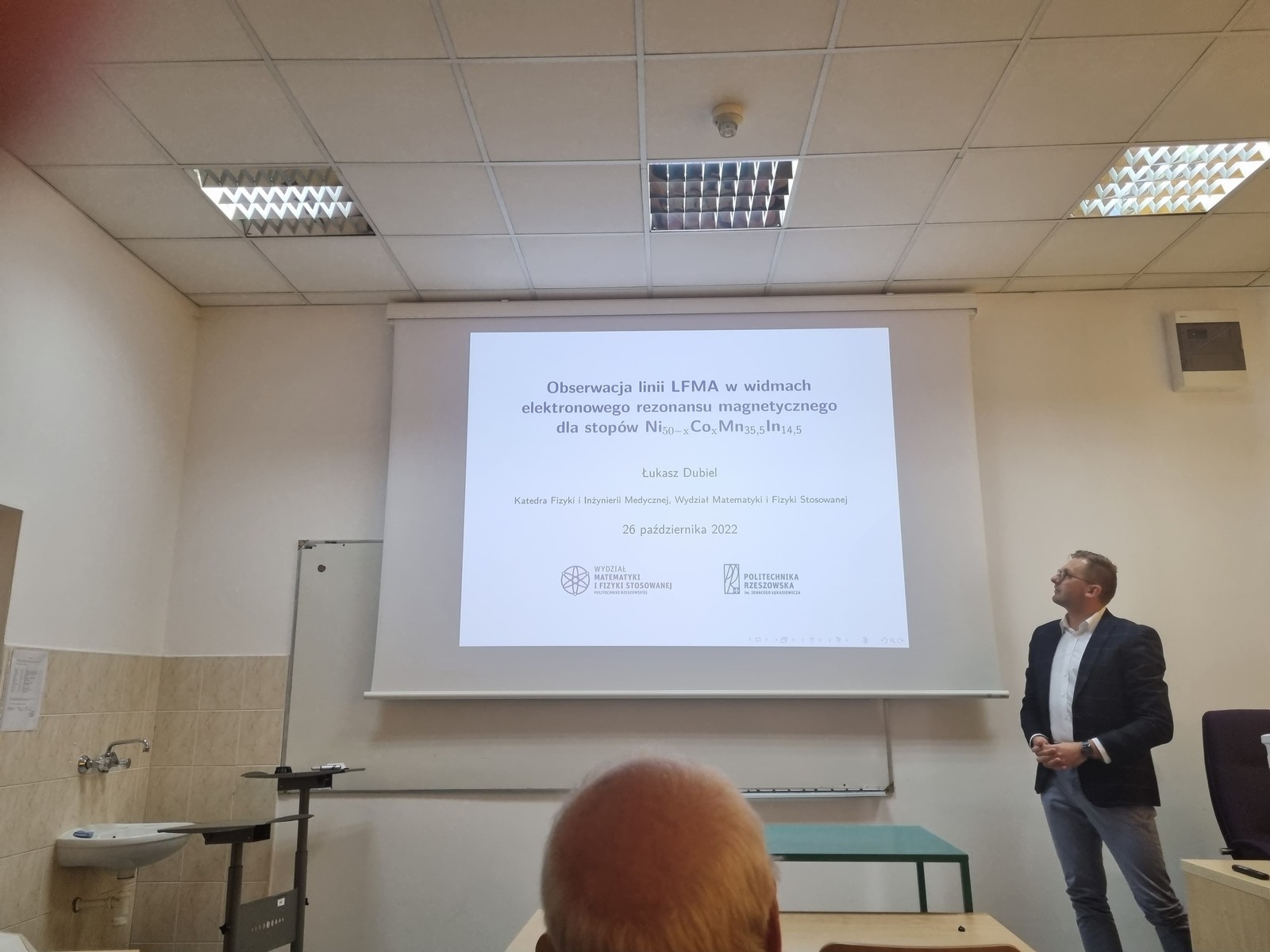 W naszych wcześniejszych pracach po raz pierwszy odnotowaliśmy występowanie linii LFMA w stopach typu Ni2MnX. Zbadaliśmy stopy Ni50-xCoxMn35,5In14,5 o różnej zawartości kobaltu pod kątem występowania sygnału LFMA oraz potwierdziliśmy jego rezonansowy charakter. Sprawdziliśmy również wpływ geometrii próbki na obecność LFMA.