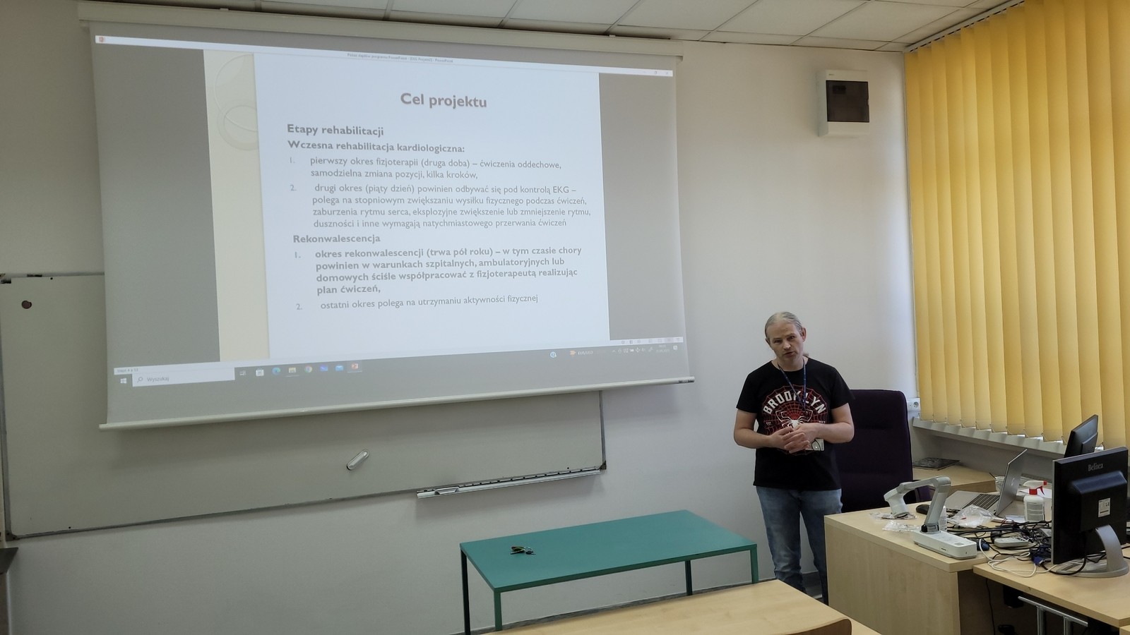 Podczas seminarium zostały zaprezentowane wyniki prac nad systemem całodobowego monitoringu kardiologicznego pacjenta. Projekt zrealizowano w ramach grantu INKUBATOR INNOWACYJNOŚCI 4.0. Prace obejmowały zaprojektowanie i wykonanie urządzenia pomiarowego z bezprzewodowym interfejsem bluetooth do przesyłu danych. System może zostać zastosowany do zdalnego monitoringu pacjenta podczas rehabilitacji kardiologicznej.