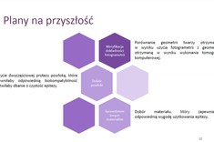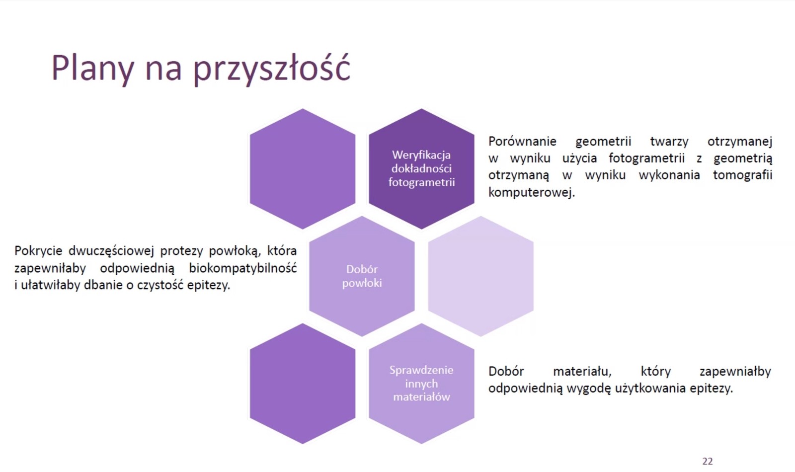 Na Seminarium zaprezentowane zostały niektóre parametry aparatów stosowanych przy fotogrametrii twarzy. Na zdjęciach przedstawione zostały rezultaty wykonania protez, ze wskazaniem zalet stosowania epitez jednoczęściowych oraz wyszczególniono oceny wyglądu i stopnia dopasowania protez. Wśród planów projektu można wymienić rozwój techniki pokrywania dwuczęściowych protez powłokami zapewniającymi biokompatybilność, ulepszanie technologii przyrostowych, dobór odpowiednich materiałów, a także zastosowanie metod porównawczych analizy geometrii twarzy, opartych na fotogrametrii i tomografii komputerowej.