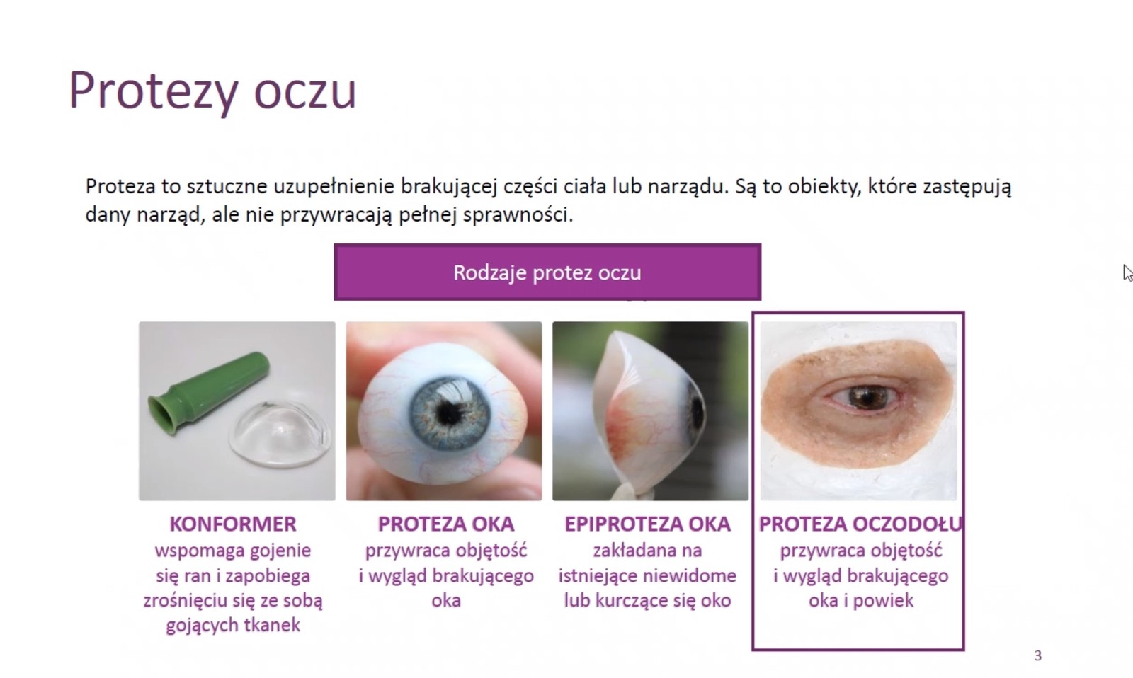 Pani mgr Wojnarowska omówiła nowatorską metodę otrzymywania epitez oka, opartą na cyfrowej obróbce danych. Technologia ta pozwala na dokładniejsze i szybsze dopasowanie ubytku oraz zapewnia większy komfort pacjenta. Dodatkowo badane są dwa rodzaje materiałów, dla których prowadzona jest analiza porównawcza. Do otrzymywania jednoczęściowych epitez wykorzystuje się żywice poliuretanowe, w przypadku epitez dwuczęściowych jest to żywica epoksydowa oraz silikon medyczny.